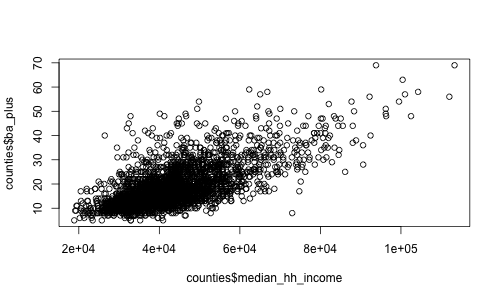 > plot(counties$median_hh_income, counties$ba_plus)