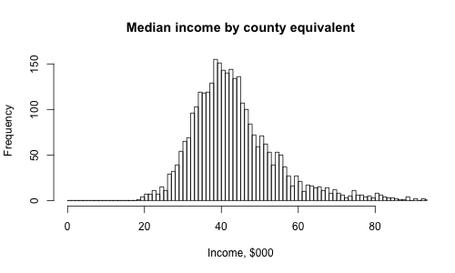 freq=TRUE, xlab="Income, $000", main="Median income by county equivalent")